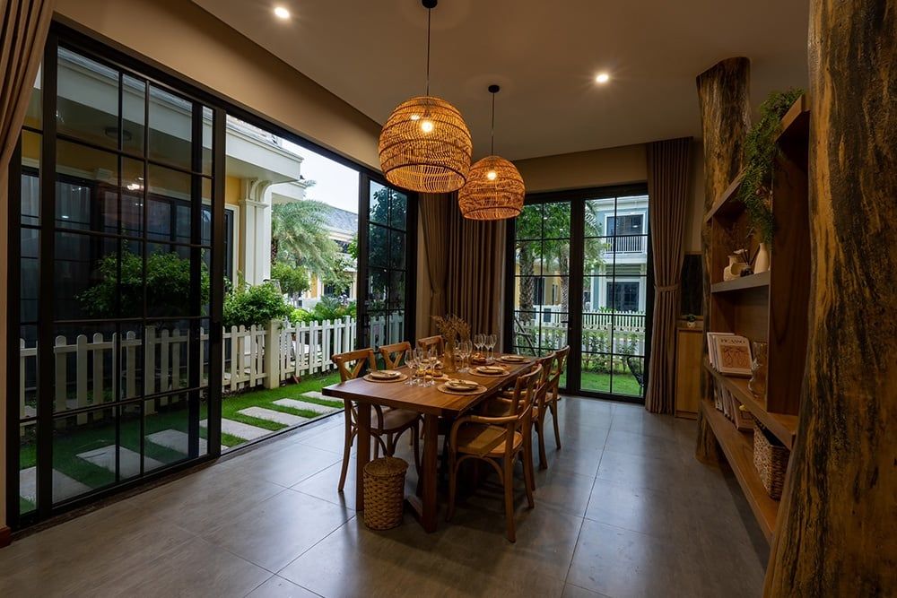 - Cửa trượt lớn (Sliding Doors): Sử dụng hệ thống cửa kính trượt xếp lớp hoặc lùa lớn tại phòng khách, phòng ăn để kết nối trực tiếp với cảnh quan bên ngoài.