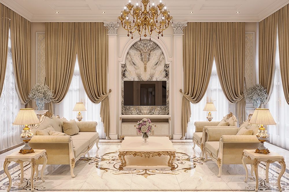 Nội thất Neoclassic áp dụng tỷ lệ vàng trong thiết kế phòng khách, tạo sự hài hòa và sang trọng tinh tế | Nguồn ảnh: Galaxycons