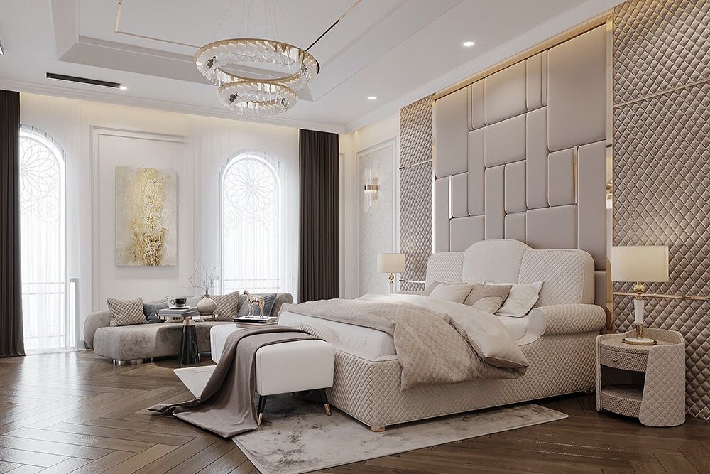 - Đường nét nội thất rời: Nội thất rời (ghế sofa, giường ngủ) vẫn giữ đường cong mềm mại của Tân Cổ Điển, nhưng loại bỏ chạm khắc rườm rà. Chỉ giữ lại đường viền, đường uốn cong trơn, tập trung vào chất lượng da, nhung bọc vật liệu cao cấp.