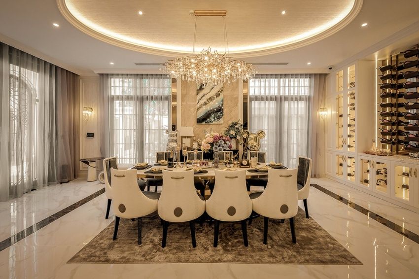 - Ánh Sáng Thông Minh: Chúng tôi không chỉ sử dụng đèn chùm pha lê lộng lẫy mà còn kết hợp hệ thống đèn downlight, đèn hắt sáng thông minh, giúp làm nổi bật các đường nét kiến trúc và tạo ra các lớp ánh sáng phù hợp với từng thời điểm trong ngày.