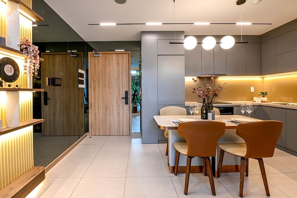 Galaxycons đã thiết kế căn hộ 1PN Happy One Sora theo tận dụng không gian mở, đảm bảo công năng và tính thẩm mỹ cao. Khu vực sinh hoạt chung được triển khai theo bố cục liền mạch: Bếp chữ L – Bàn ăn tròn/oval – Phòng khách. Chúng tôi sử dụng nội thất gỗ tone màu trung tính (Kem/Beige) và kính ốp bếp màu Hổ Phách để tạo sự ấm cúng và sang trọng cho khu vực bếp, đồng thời tối đa hóa lưu trữ bằng phụ kiện thông minh. Phòng ngủ master được cá nhân hóa với vách đầu giường ngủ tối giản và ánh sáng Vàng Dịu dễ ngủ.