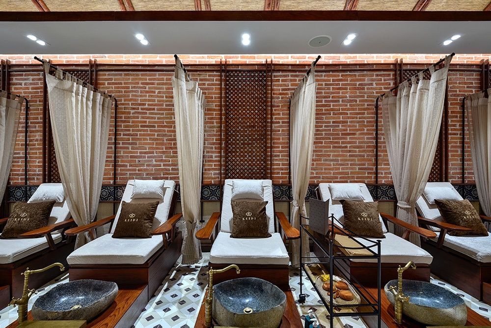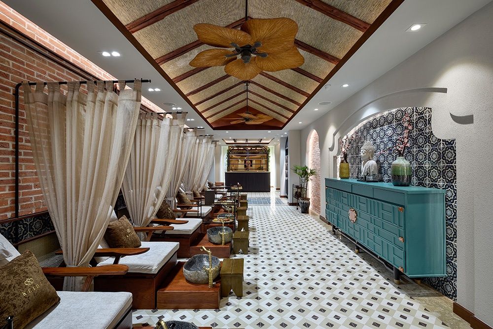 - Sự giao thoa giữa trong và ngoài: Sử dụng tường cây xanh, tiểu cảnh nước, và tận dụng tối đa ánh sáng tự nhiên. Điều này không chỉ làm không gian trở nên trong lành, mát mẻ mà còn tạo cảm giác thư thái, dễ chịu, giúp khách hàng được "chữa lành" sau những căng thẳng của cuộc sống.