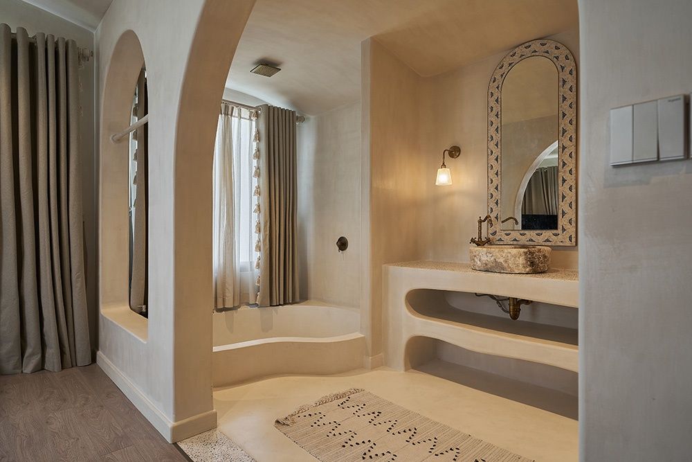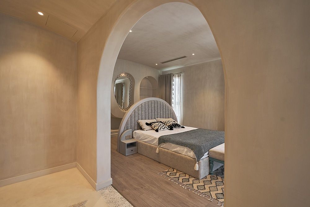 Đây là yếu tố kiến trúc độc đáo nhất của dự án. Lấy cảm hứng từ những ngôi nhà trên vách núi đá của vùng biển Hy Lạp, các kiến trúc sư của chúng tôi đã tạo ra những mảng tường và trần cong tự nhiên. Khi bước vào phòng khách và phòng ăn, bạn sẽ có cảm giác như đang ở trong một vịnh đá mát mẻ, nhìn ra đại dương xanh thẳm. Sự liền mạch này không chỉ mang lại hiệu ứng thị giác ấn tượng mà còn tạo ra cảm giác bao bọc, an toàn, giúp bạn hoàn toàn thư giãn.