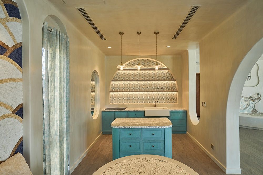 Với thị giác được thỏa mãn bởi màu sắc tươi mới, những đường cong mềm mại và họa tiết mosaic độc đáo. Xúc giác cảm nhận sự gần gũi từ các vật liệu tự nhiên như gỗ, đá, vỏ sò và thính giác cảm nhận tiếng sóng biển từ xa cùng sự tĩnh lặng trong không gian giúp bạn hoàn toàn thư thái. Với nội thất trang hoàng theo phong cách Địa Trung Hải, tạo nên một không gian riêng tư, ấm cúng nhưng vẫn đầy tính nghệ thuật.