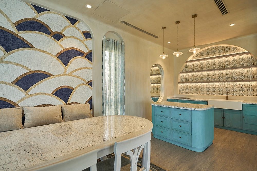 Khu vực phòng ăn nổi bật với mảng tường mosaic lượn sóng, mang hơi thở của đại dương hiền hòa | Nguồn: GALAXYCONS